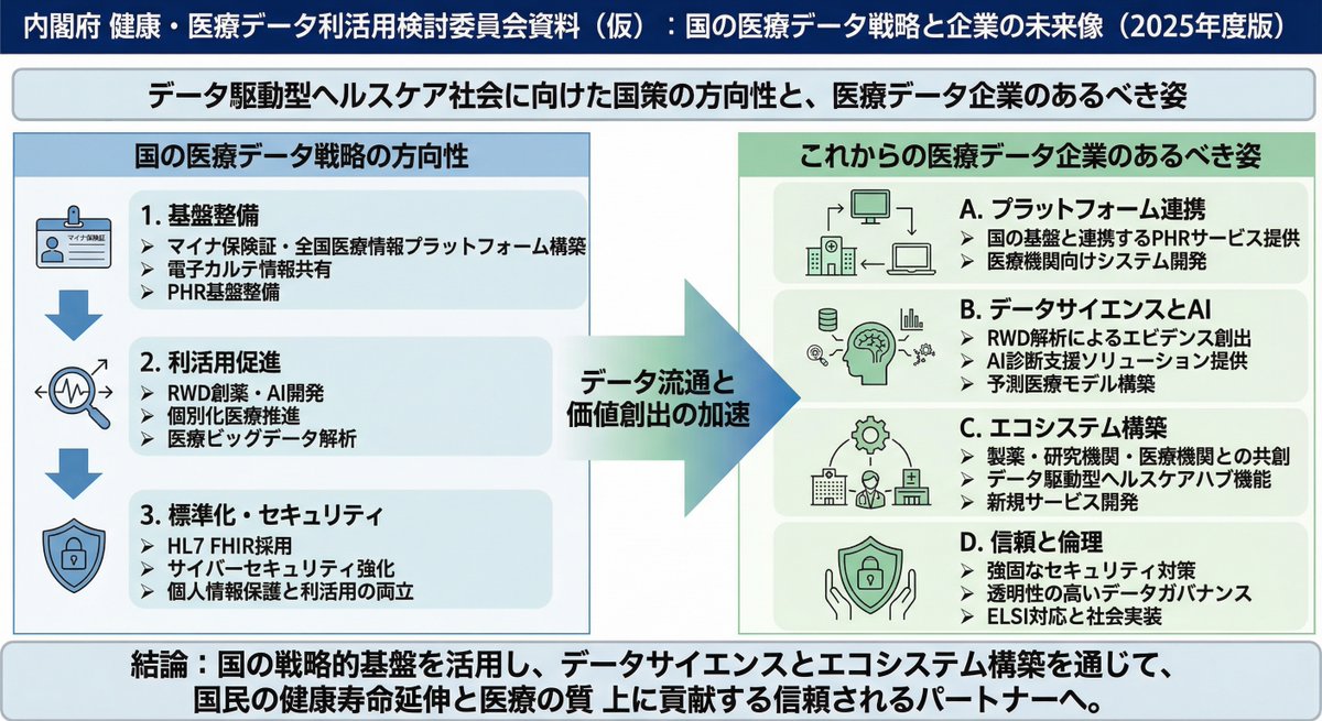 A Japanese prompt that asks Nano Banana Pro to research the future direction of national policy on medical data and generate a dense, Cabinet Office-style slide on how medical data companies should be.