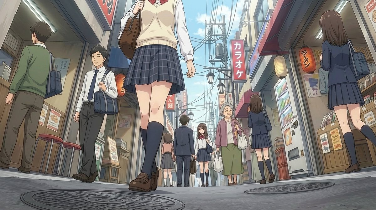 A very short Japanese prompt requesting the scene to be rendered from an ultra low camera angle.