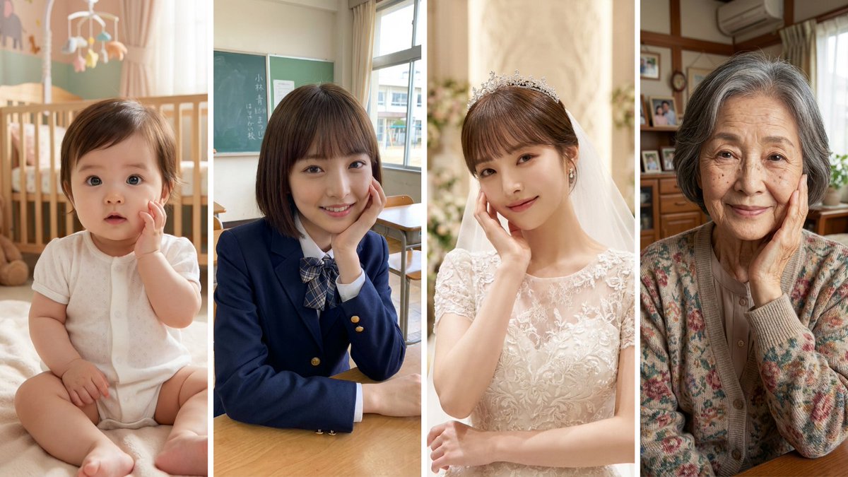 A Japanese prompt that transforms the adult woman from the first image into an elderly close-up with older-style clothing and a home background, used for visualizing growth or aging.