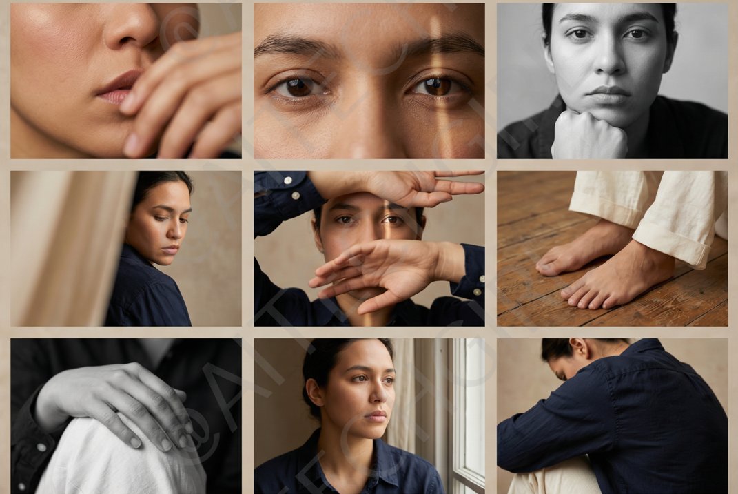This is a detailed, multi-shot prompt designed for generating a 3x3 editorial photo grid in a clean, soft beige studio setting, specifically tailored for the 'Nano Banana Pro' style. It specifies character appearance, lighting, composition, camera settings (lens, aperture, DOF), and overall mood for nine distinct portrait shots, focusing on intimate, introspective, and character-led editorial minimalism.