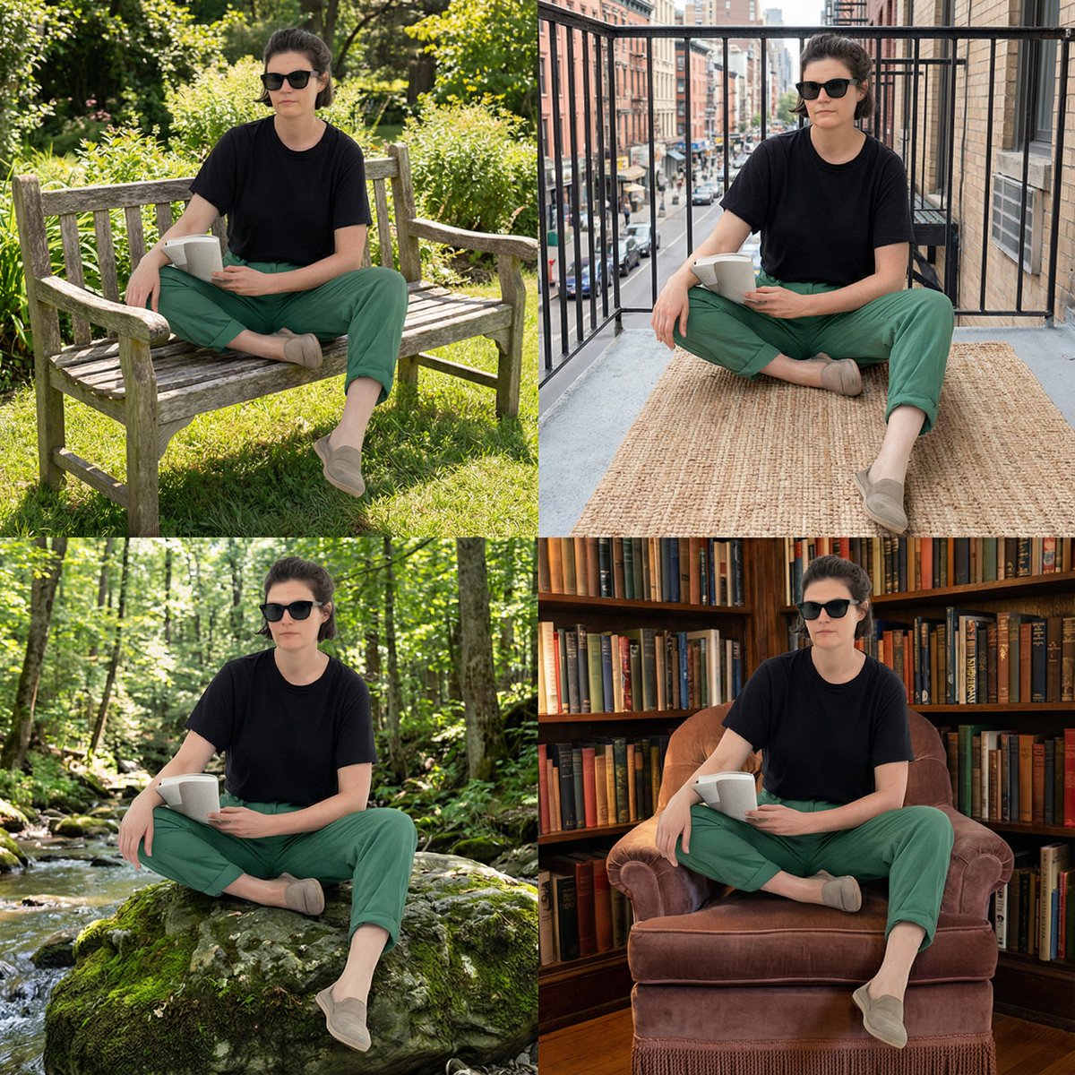 A simple prompt for Nano Banana Pro instructing it to show a specific PNG character sitting in four different, unusual locations.