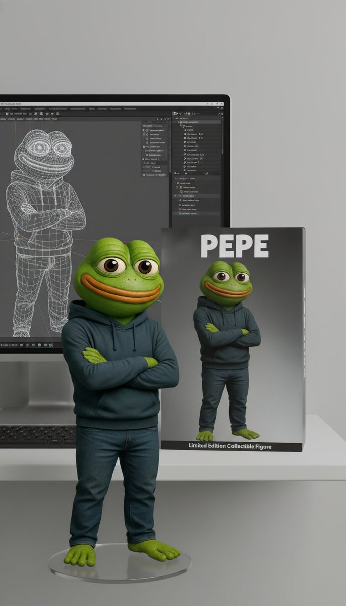 A prompt designed to transform an existing character (implied by 'Transform this character') into a physical collectible PVC figure displayed in a product showcase setting. The scene includes the figure on a base, its product box, and a computer monitor showing the 3D modeling process in Blender.