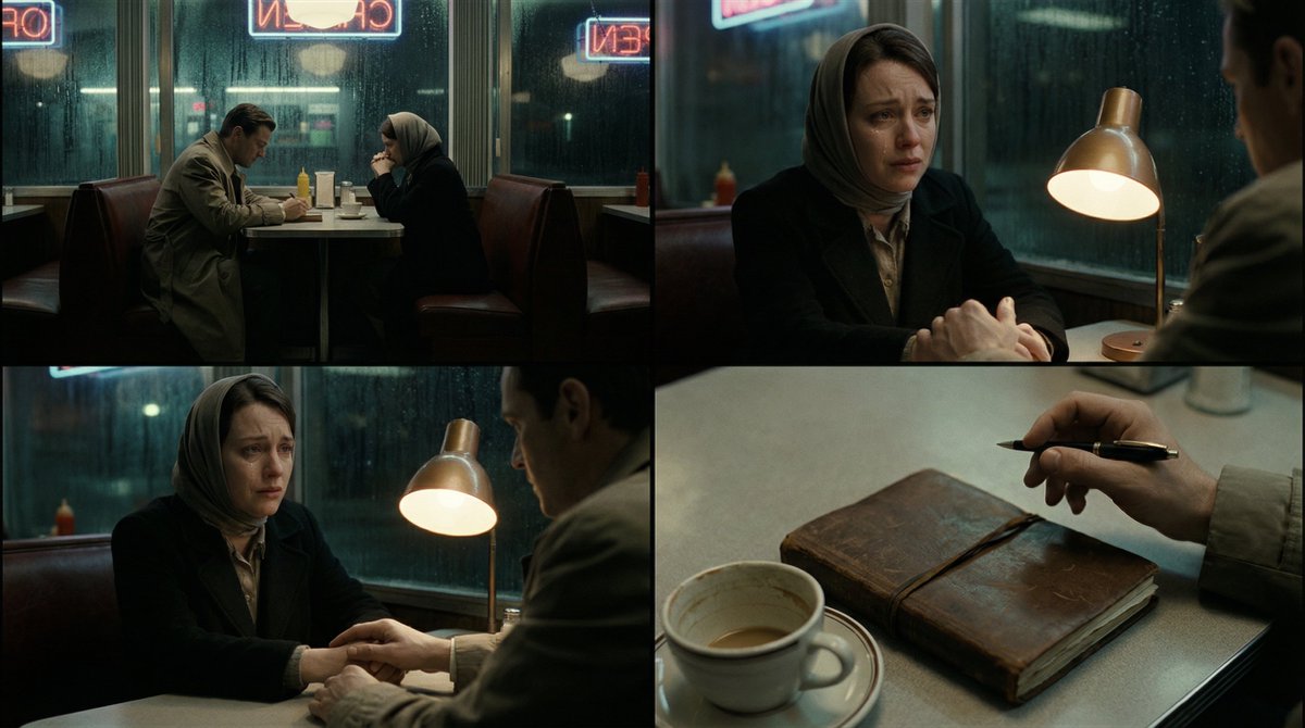 A versatile prompt template for Nano Banana Pro designed to generate a sequence of cinematic frames (establishing shot, mid-shot, close-up) for a storytelling scene, ensuring character consistency and applying a moody, Hollywood-grade aesthetic.