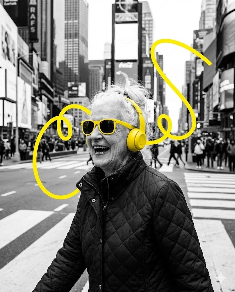 A complex JSON-formatted prompt for generating a hyperrealistic urban street portrait of a cool elderly woman, rendered in black and white with selective color applied only to bright yellow accessories (sunglasses and headphones), capturing a joyful, energetic candid moment.
