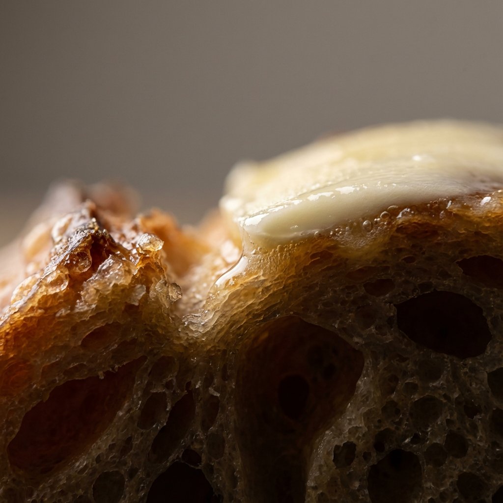A prompt for generating an extreme macro shot of a food item, focusing on the microscopic landscape of its textures, using soft, diffused side-lighting (chiaroscuro) to emphasize topography, with needle-sharp focus and creamy bokeh.