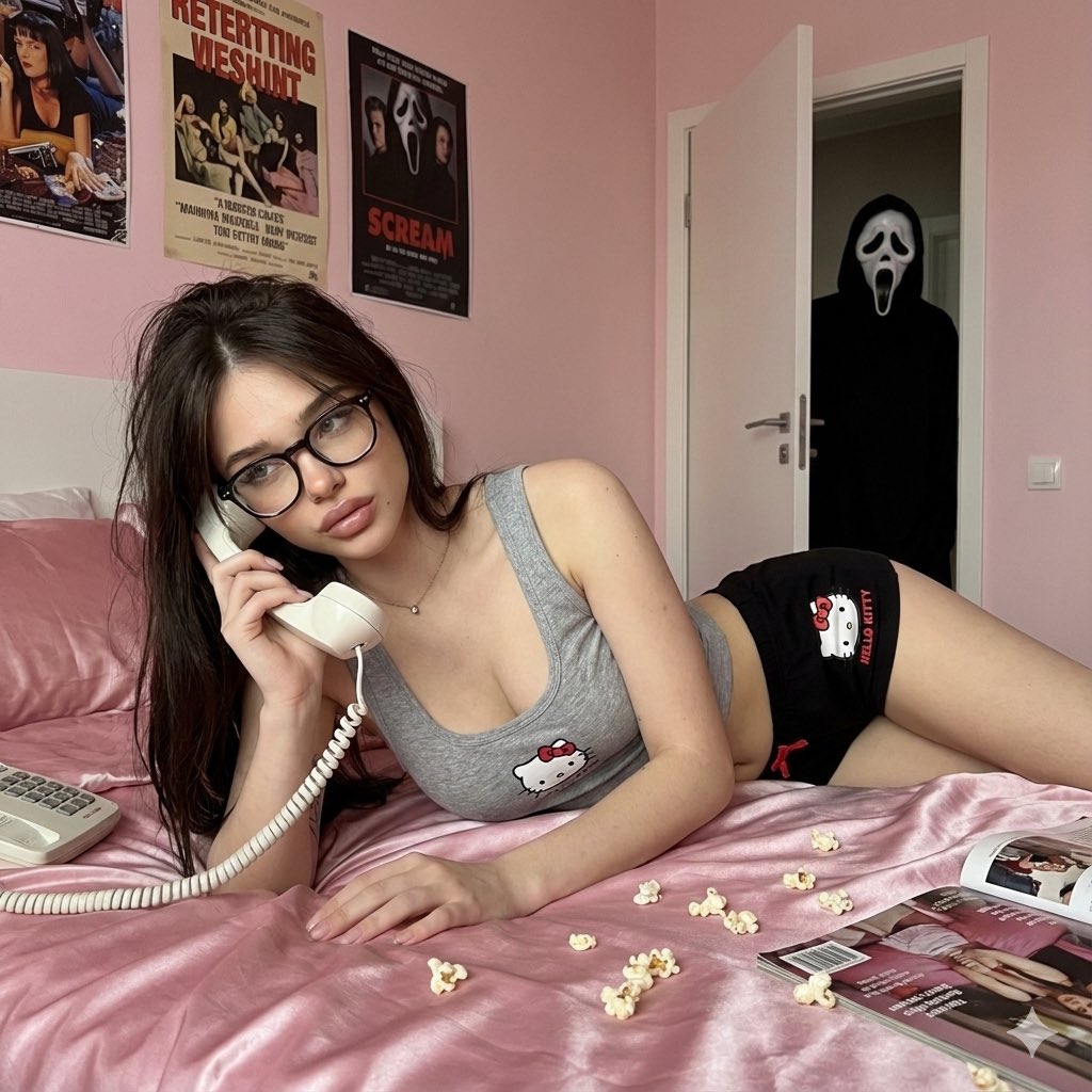 A complex JSON-formatted prompt designed to generate a realistic, unedited-style phone photo of a woman in Hello Kitty pajamas on a bed, with a hidden narrative element: a figure wearing a Scream mask visible in the background doorway.