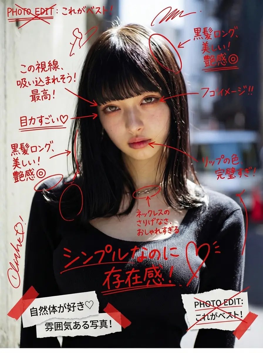 A detailed prompt for Higgsfield Nano Banana Pro that automatically analyzes an uploaded image of a woman and adds spontaneous, expressive, and positive handwritten Japanese comments, doodles, and editorial markings directly onto the image, creating a visually intense, personalized scrapbook aesthetic.