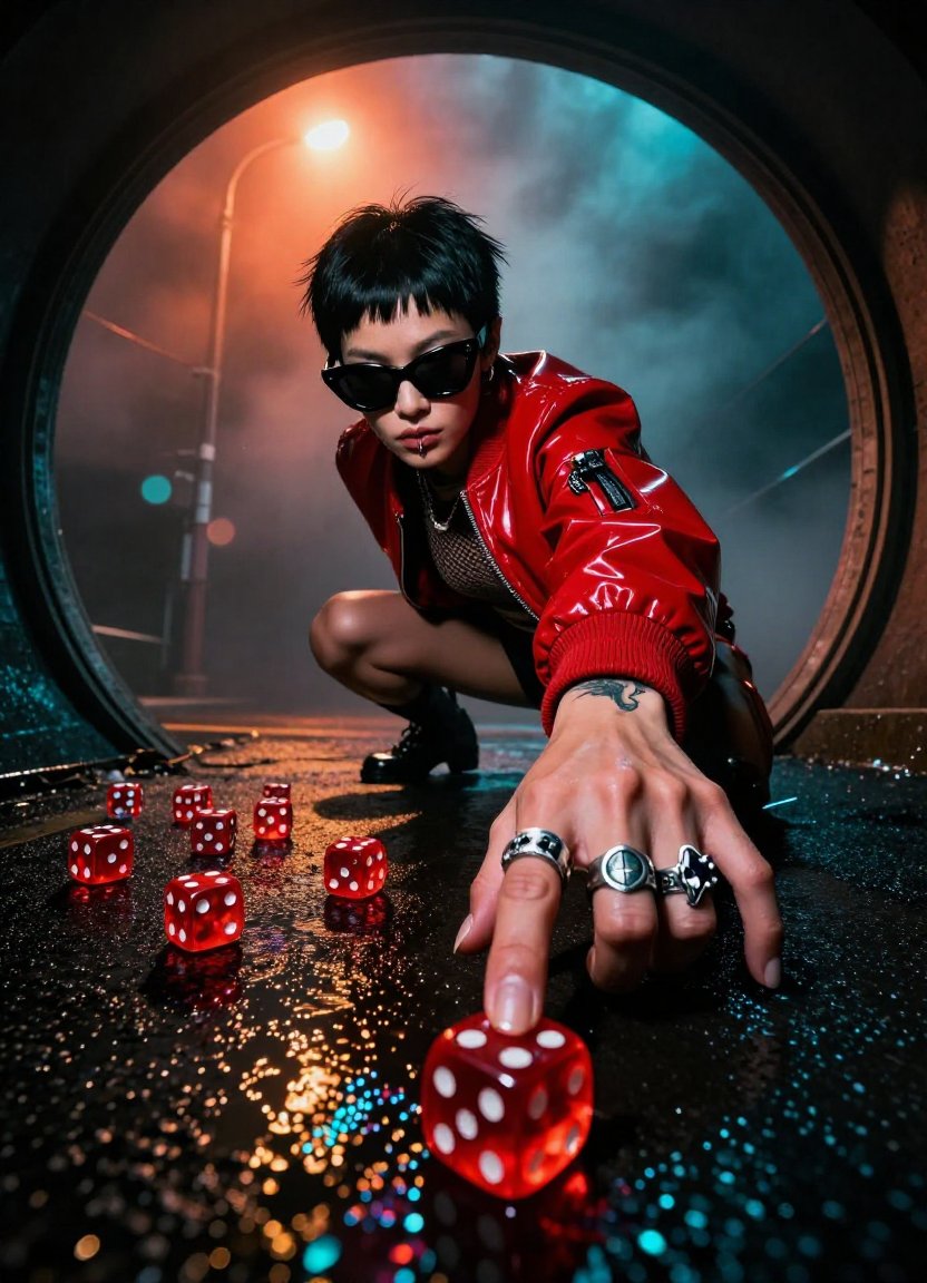 An extremely detailed, technical prompt for generating a cinematic neo-noir image using an extreme worm's-eye view from inside a drainage pipe. It meticulously describes the subject's appearance (Asian female, pixie cut, cat-eye sunglasses, vinyl bomber jacket), accessories (silver rings, dragon tattoo), composition (forced perspective, splayed fingers), lighting (sodium-vapor, volumetric fog, teal & orange grading), and camera/post-processing specs.